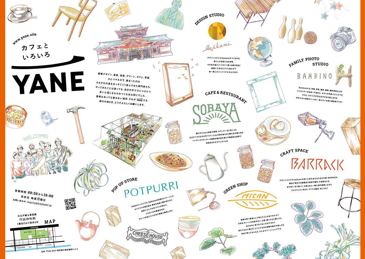 門前仲町の複合施設YANEのPOSTRイラストを制作しました。素敵なお店なのでぜひ。