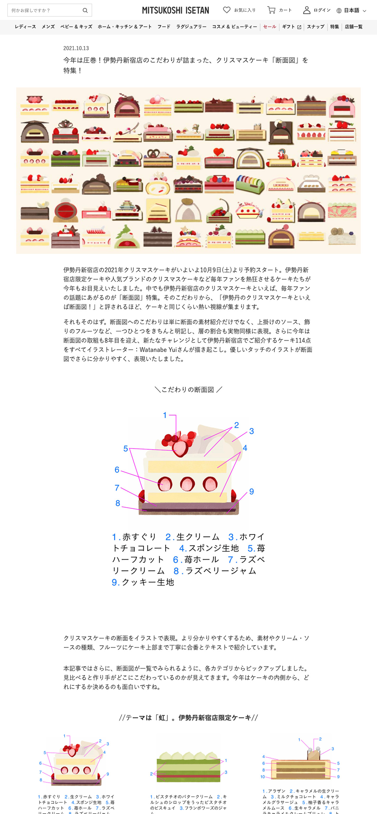伊勢丹新宿 クリスマスケーキ 2021 イラストレーションをたくさん描かせていただきました 特集記事でもご紹介、コメントまで掲載いただきまして恐縮です…!